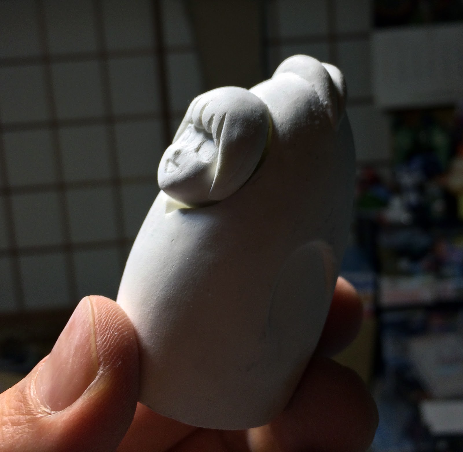 粘土がやわらかいうちに大まかな形を作って、硬化したところでデザインナイフや彫刻刀で削り、足りないところは湿らせて粘土を足してやり、固まったらまた削り。